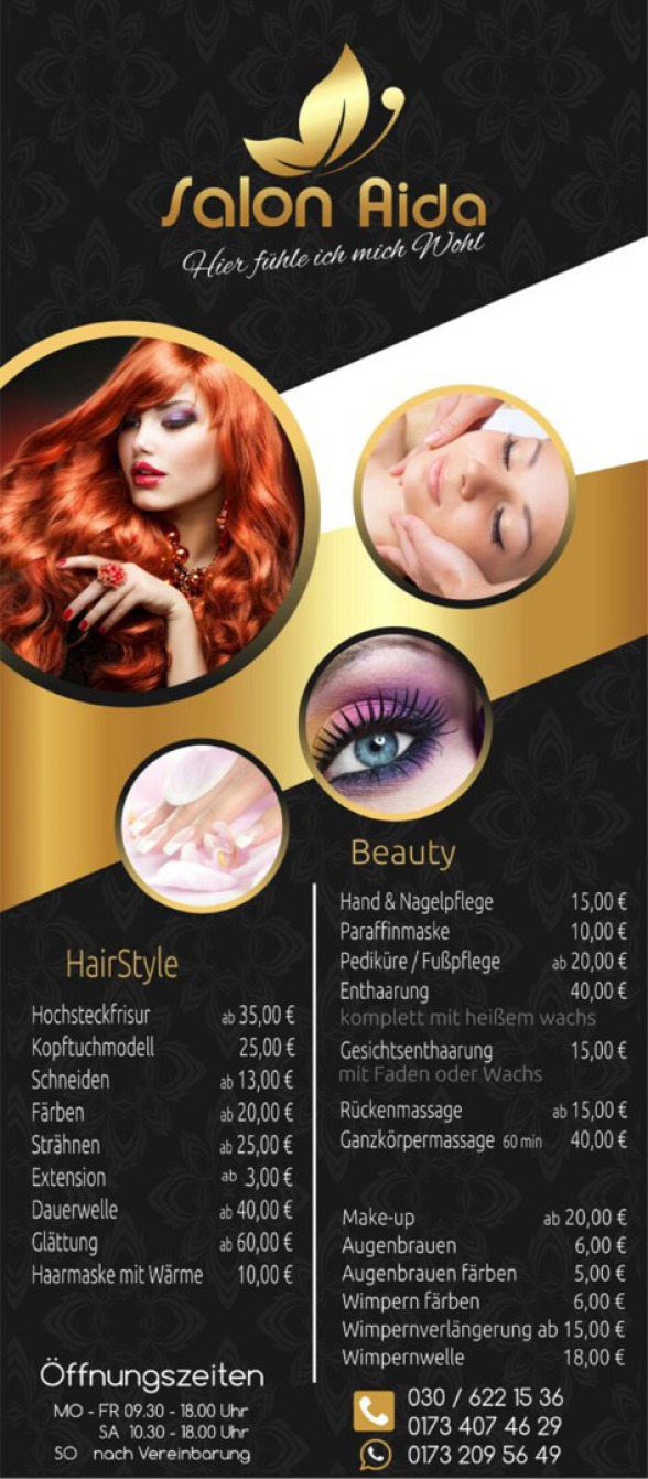 Sie möchten von Kopf bis Fuß bedient werden? Dann sind Sie bei uns genau richtig. Unser Salon ,der sich ausschließlich um die Schönheit und Wohlergehen weiblicher Kundinnen kümmert,bietet neben modernste Friseuren ,Schnittechniken,und Farben,auch Gesicht Behandlungen sowie Maniküre und Pediküre. Hochsteckfrisuren, perfektes Make-Up sowie Hijab -Modelle werden ebenfalls angeboten .